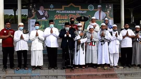 Sibolga, POL | Walikota Sibolga Drs. HM Syarfi Hutauruk bersama staf sholat Idul Fitri 1441 H di Lapangan Simaremare Sibolga Minggu (24/5/2020) Hal itu dilakukan karena Kota Sibolga masuk kategori zona hijau Covid-19, tanpa ada kasus pun, sehingga Sholat Ied dapat dillaksanakan di Lapangan dan Masjid.