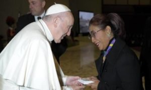 Vatikan, POL | Menteri Kelautan dan Perikanan Susi Pudjiastuti, dalam rangkaian kunjungan kerjanya ke Vatikan, mendapat kesempatan bertemu dengan Paus Fransiskus pada Rabu sore (12/12). Pada kesempatan tersebut Paus memberinya sebuah medali kenang-kenangan.