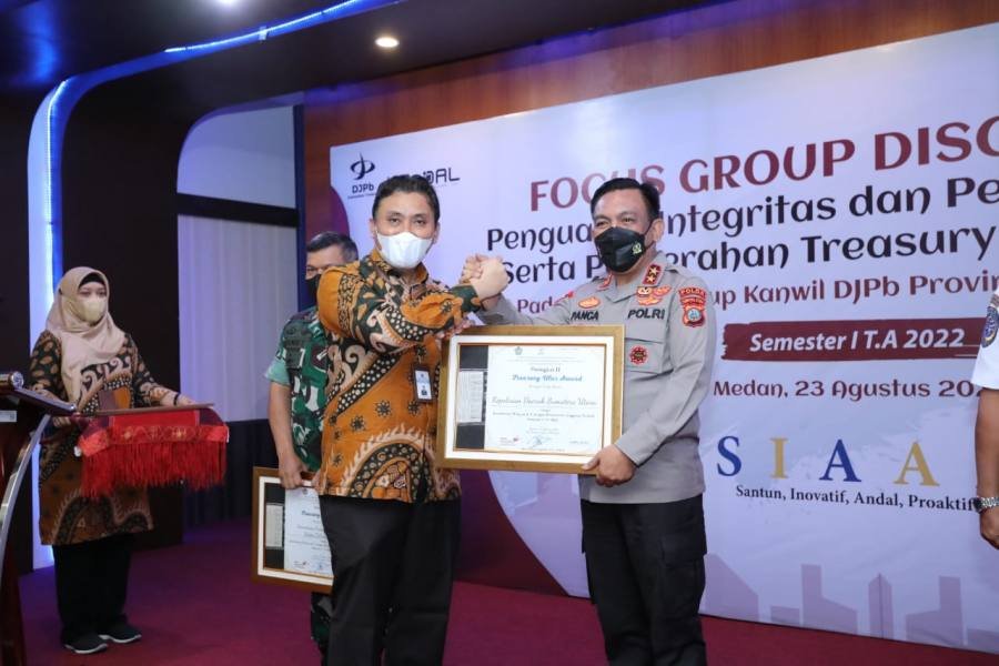 Medan, POL | Polda Sumatera Utara menerima penghargaan “Treasury Ulos Award Semester I Tahun 2022” sebagai Koordinator wilayah Kementerian Negara/Lembaga yang memiliki kinerja terbaik dalam pengelolaan anggaran periode Semester I Tahun 2022