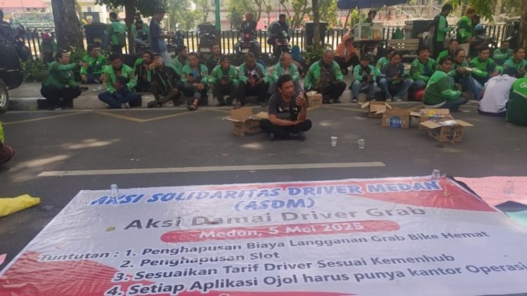 Medan, POL | Ratusan pengemudi ojek online (Ojol) di Kota Medan menggeruduk kantor DPRD Sumatera Utara (Sumut) untuk menyampaikan tuntutan kesejahteraan, Senin (5/5/2025).