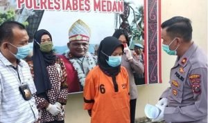 Medan, POL | Tanti Novita Damanik (35) warga Jalan Datuk Kabu, Pasar 3, Kecamatan Medan Tembung, terlihat lesu saat digiring petugas Unit Reskrim Polsek Medan Timur.