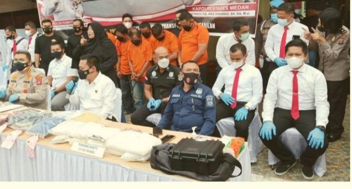 Turut mendampingi Dirkrimum Polda Sumut, Kombes Pol Tatan Dirsan Atmaja, Kapolrestabes Medan Kombes Pol Riko Sunarko, SIK, MSi, Kasubbid Penmas Poldasu, AKBP MP Nainggolan, Kapolsek Helvetia, Kompol Pardamean Hutahean, Kanit Reskrim Polsek Helvetia, Iptu Zuhatta Mahadi, di Mapolrestabes, Rabu (2/5/2021).