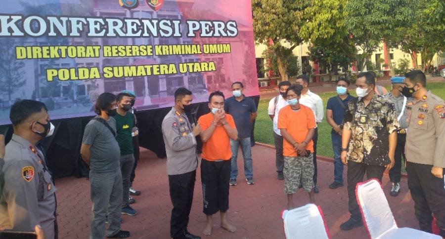 Medan, POL | Dua kasus penganiayaan yang sama di wilkum Polsek Sunggal dan Polsek Pancur Batu, dipaparkan sekaligus di Mako Polda Sumatera Utara, Jalan SM Raja KM 10,5 Medan, Jumat (28/1/2022).