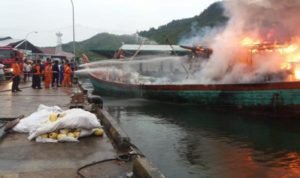 Sibolga, POL | Dua orang anak buah kapal (ABK) tewas terpanggang setelah kapan nelayan yang mereka tumpangi terbakar. Kebakaran itu terjadi, tak lama setelah kapal yang menangangkut sekitar 10 orang ABK itu bersandar di dermaga PPN Sibolga, Selasa (30/4/2019) pagi.