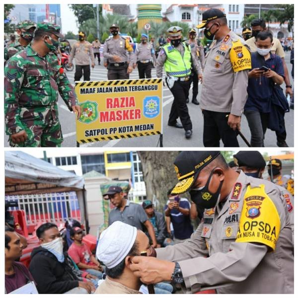 Kapolda Sumut Irjen Pol. Drs. Martuani Sormin M.Si Turut langsung melaksanakan razia masker di lapangan Merdeka Kota Medan hingga meninjau ke stasiun kereta api medan mulai dari loket hingga ruang tunggu keberangkatan penumpang kereta api.