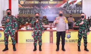 Medan, POL | TNI dan Polri di Sumatera Utara mengikuti rapat pimpinan (Rapim) TNI-Polri Tahun 2021 yang digelar secara virtual di Ruang Pertemuan Utama (Rupatama) Mabes Polri, Senin (15/02/21). Rapim TNI-Polri 2021 dipimpin Panglima TNI Marsekal Hadi Tjahjanto dan Kapolri Jenderal Polisi Listyo Sigit Prabowo.