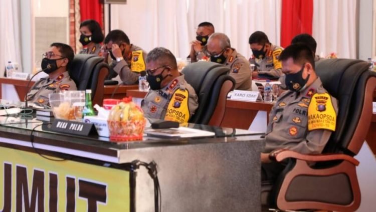 Medan, POL | Kapolda Sumut Irjen Pol Drs Martuani Sormin,M.Si bersama Wakapolda Sumut, Brigjen Pol Dr Dadang Hartanto, SH, S.I.K., M.Si, Ka BNNP Sumut Brigjen Pol Drs Atrial,S.H, dan PJU Polda Sumut mengikuti Rapim Polri Tahun 2021 secara virtual di Aula Tribrata Mapolda Sumut.