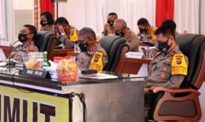 Medan, POL | Kapolda Sumut Irjen Pol Drs Martuani Sormin,M.Si bersama Wakapolda Sumut, Brigjen Pol Dr Dadang Hartanto, SH, S.I.K., M.Si, Ka BNNP Sumut Brigjen Pol Drs Atrial,S.H, dan PJU Polda Sumut mengikuti Rapim Polri Tahun 2021 secara virtual di Aula Tribrata Mapolda Sumut.