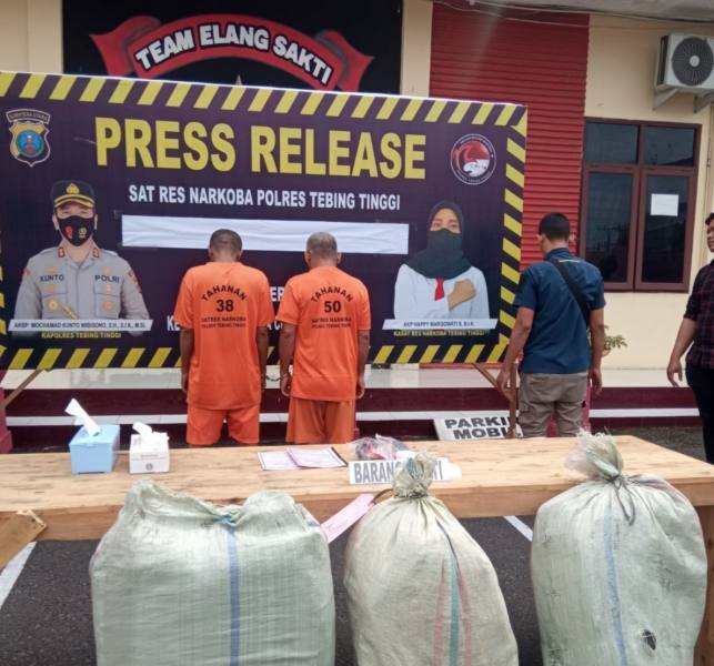 Tebing Tinggi, POL | Kapolres Tebing Tinggi, AKBP Muh. Kunto Wibisono didampingi Kasat Narkoba AKP Happy Margowati, Kapolsek Tebing Tinggi, AKP Simanjotang memaparkan penangkapan 3 karung goni ganja kering (50.700 gram) dan 2 pelaku, Selasa (21/06/2022) pukul 11.00 Wib.