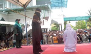 Banda Aceh, POL | Warga berinisial RN memilih dihukum cambuk setelah terbukti mesum di sebuah hotel. Dia tampak tenang saat algojo mendaratkan rotan di punggungnya.