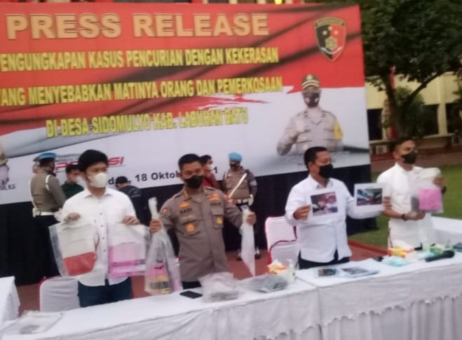 Medan, POL | Kasus pembunuhan dan pemberatan yang mengakibatkan korban tewas di Labuhan Batu di paparkan dalam konferensi pers di Mapolda Sumut oleh Direktur Kriminal Umum, Kombes Pol Tatan Dirsan Atmaja didampingi Kabid Humas Polda Sumut, Kombes Pol Hadi Wahyudi dan personil Polres Labuhan Batu, Senin (18/10/21).