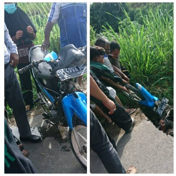 Penemuan sepeda motor tersebut, berawal saat beberapa orang memancing di dekat jembatan putus, warga terlebih dulu melihat ban sepeda motor yang mengambang di atas permukaan air sungai, tepatnya pas di bawah jembatan putus tersebut. Penasaran para pemancing mendekati dan ternyata saat diangkat, mereka menemukan satu unit sepeda motor jenis Suzuki Smash warna biru BK 4998 HD dengan kondisi hancur pada bagian depan.