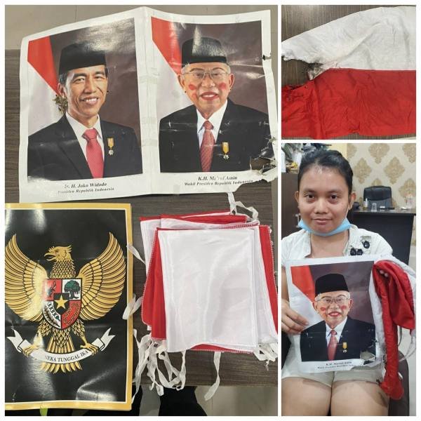 Kemudian, akun Instagram atas nama maya.maya635, sikat WC warna biru, foto Presiden RI Joko Widodo dan Wakil Presiden atas nama KH MA’RUF AMIN yang telah dirusak serta Bendera Republik Indonesia yang telah dibakar.