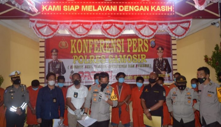 Samosir, POL | Dalam kurun waktu 2 bulan, Juli-Agustus 2021, jajaran personil Polres Samosir berhasil mengamankan 11 tersangka pelaku berbagai jenis kejahatan berikut barang bukti. Para tersangka kini ditahan di Mapolres Samosir.