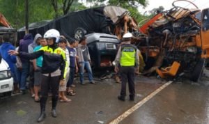 Dua truk tronton bermuatan alat berat dan tanpa muatan (kosong) yang datang dari arah berlawanan terlibat tabrakan ‘laga kambing’. Akibat kejadian tersebut, tiga orang dilaporkan tewas.
