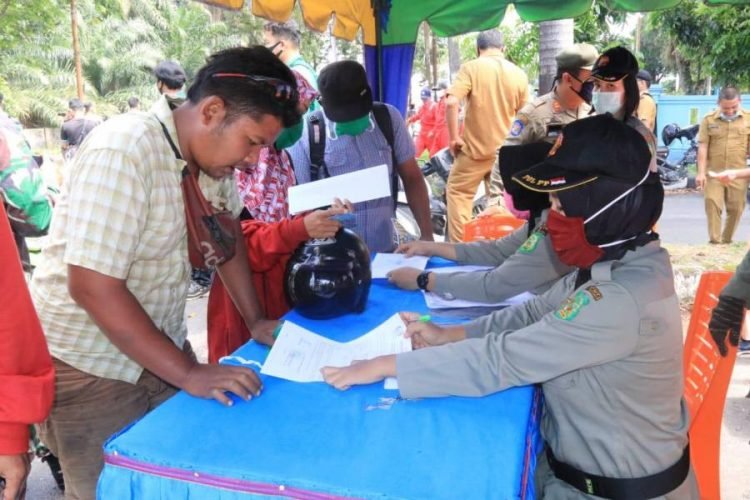 Medan, POL | Sebanyak 111 warga terjaring razia masker yang digelar di depan Terminal Amplas Jalan Panglima Denai Kelurahan Timbang Deli Kecamatan Medan Amplas, Senin (24/8). Razia ini digelar guna menegakkan Peraturan Wali Kota (Perwal) Medan Nomor 27 Tahun 2020 tentang Pelaksanaan Adaptasi Kebiasaan Baru pada Kondisi Pandemi Corona Virus Disease 2019 (Covid-19) di Kota Medan serta Peraturan Gubernur (Pergub) Pemprov Sumut Nomor 34 Tahun 2020 tentang Peningkatan Disiplin dan Penegakan Hukum Protokol Kesehatan Dalam Pencegahan dan Pengendalian Covid-19 di Provinsi Sumatera Utara.