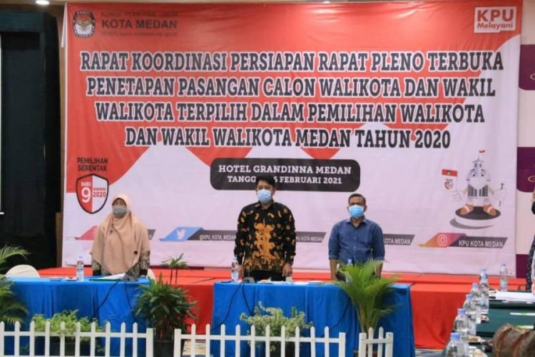 Medan, POL | Ketua Komisi Pemilihan Umum (KPU) Kota Medan Agussyah Damanik menetapkan Rapat Pleno Penetapan Pasangan Calon (paslon)  Wali Kota dan Wakil Wali Kota Terpilih pada Pemilihan Wali Kota dan Wakil Wali Kota Tahun 2020 di Hotel Arya Duta Medan, Jalan Kapten Maulana Lubis,  Kamis (18/2/2021).