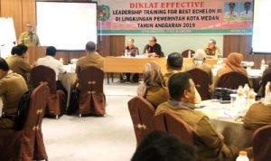 Medan, POL | Pemko Medan melalui Badan Kepegawaian Daerah dan Pengembangan Sumber Daya Manusia (BKDPSDM) Kota Medan menggelar Diklat Effective Leadership Training For Best Echelon III di Lingkungan Pemko Medan Tahun Anggaran 2019 di Hotel Polonia, Jalan Sudirman Medan, Senin (17/6). Tujuan diklat ini digelar untuk memberikan pelatihan bagi pejabat eselon III agar meningkatkan mutu kapasitas kepribadian serta kepemimpinan sehingga menjadi ASN yang produktif dan penuh inovatif dalam bekerja.