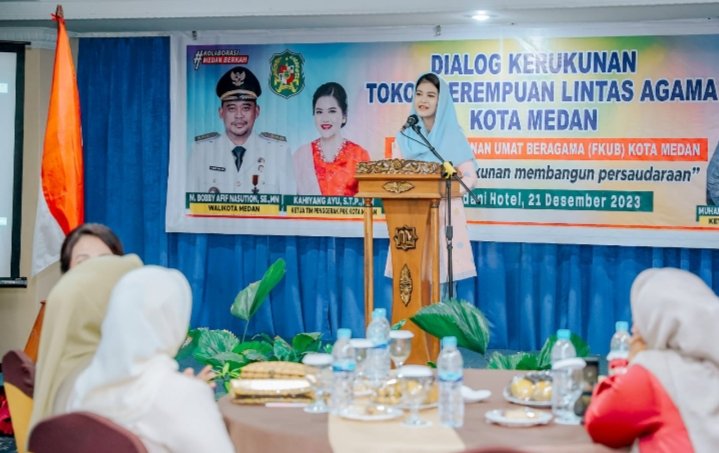 Medan, POL | Ketua TP PKK Kota Medan Kahiyang Ayu M Bobby Afif Nasution sangat mengapresiasi dan mendukung penuh digelarnya Dialog Kerukunan dengan Tokoh-Tokoh Perempuan Lintas Agama Kota Medan. Melalui kegiatan ini, diharapkan kaum perempuan dapat ikut serta dalam upaya memelihara suasana kondusif dan harmonis antar agama di Kota Medan.
