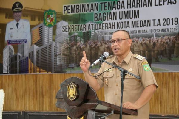 Medan, POL | Pemko Medan menggelar pertemuan dengan Tenaga Harian Lepas (THL) Bagian Umum Sekretariat Daerah Kota Medan Tahun 2019 di Gedung Serbaguna PKK Kota Medan, Selasa (10/12/2019). Pertemuan digelar dalam rangka untuk memberikan pembinaan guna mewujudkan terbangunnya karakter pribadi yang dapat menunjang pelaksanaan tugas sehari-hari sesuai dengan tupoksinya.