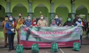Medan, POL | Pelaksana tugas (Plt) Wali Kota Medan Ir H Akhyar Nasution MSi membagikan 300 paket yang berisikan sejumlah bahan kebutuhan pokok kepada warga di halaman Masjid Al Ikhlas Jalan Alumunium 3 Lingkungan XII, Kelurahan Tanjung Mulia, Kecamatan Medan Deli, Selasa (28/7/2020). Bantuan yang dibagikan tersebut merupakan Corporate Social Responsibility (CSR) dari Indomaret dan PT Sari Husada (SGM).