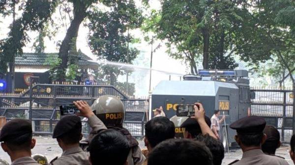 Mengantisipasi kericuhan, aparat kepolisian langsung mengerahkan 3 unit mobil water canon untuk untuk menghalau massa mahasiswa yang lari ke lapangan benteng. Dalam aksi demo itu, satu mobil patroli kepolisian terbakar dan lima unit lannya rusak. (POL/rm/W)