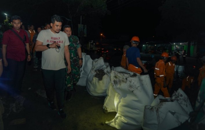 “Malam ini kita meninjau pemasangan tanggul sementara. Pemasangan tanggul ini juga dilakukan untuk mendukung pemasangan tiang pancang berkolaborasi dengan Kodim 0201/Medan dan Balai Wilayah Sungai (BWS) Sumatera II,” kata Bobby Nasution.