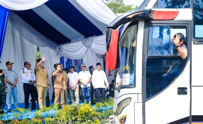 Pelepasan mudik bareng Pemko Medan 2026 ini dilakukan langsung Wali Kota Medan Rico Tri Putra Bayu Waas didampingi Wakil Wali Kota Medan H Zakiyuddin Harahap di Terminal Amplas, Senin (16/3/2026). Turut hadir Kakankemenag Kota Medan Impun Siregar, unsur Forkopimda diantaranya Kapolrestabes Medan Kombes Pol Jean Calvijn Simanjuntak, Dandenpom I Medan, perwakilan Dandim 0201/ Medan, perwakilan Kajari Medan dan Kepala BPTD Wilayah II Sumut, Ariyandi Ariyus serta Plt Kadis Perhubungan, Suriono dan segenap Pimpinan Perangkat Daerah.