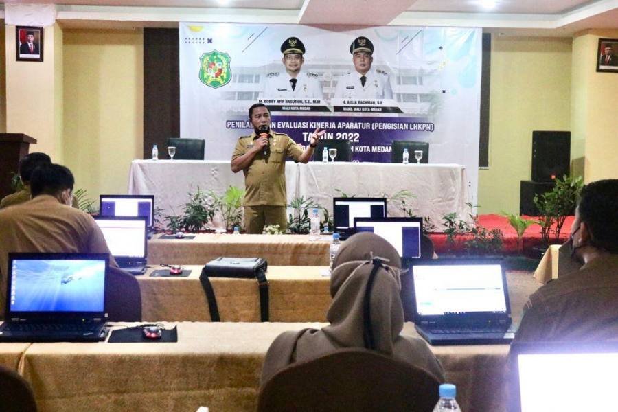 Medan, POL | Pemko Medan melalui Badan Kepegawaian Daerah dan Pengembangan Sumber Daya Manusia (BKDPSDM) Kota Medan melaksanakan kegiatan Penilaian dan Evaluasi Kerja Pengisian Laporan Harta Kekayaan Penyelenggara Negara (LHKPN) Tahun 2021, Senin (7/2/2022) di Hotel Grand Kanaya Medan. Dalam kegiatan ini, BKDPSDM menyiapkan tempat, fasilitas, dan tenaga pendamping untuk membantu pejabat di lingkungan Pemko Medan dalam pengisian LKHPN.