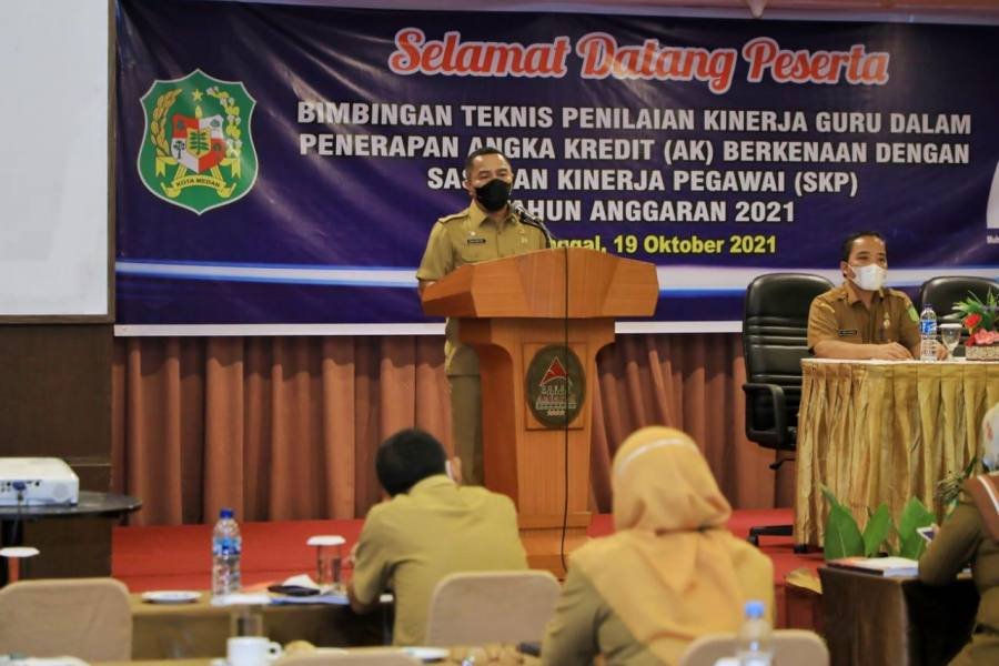 Medan, POL | Guna meningkatkan kompetensi kualitas Sumber Daya Manusia (SDM) sesuai dengan visi misi Wali Kota Medan Bobby Nasution, Badan Kepegawaian Daerah dan Pengembangan Sumber Daya Manusia (BKDPSDM) Kota Medan menggelar Bimbingan Teknis penilaian kinerja guru dalam penerapan Angka Kredit (AK) berkenaan dengan Sasaran Kinerja Pegawai (SKP) di Hotel Grand Antares, Jalan Sisingamangaraja, Medan, Selasa (19/10/2021).