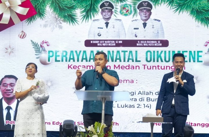 Pesan ini disampaikan Wali Kota diwakili Kadis Sumber Daya Air Bina Marga Bina Konstruksi (SDABMBK), Topan Obaja Putra Ginting, dalam Perayaan Natal Oikumene Kecamatan Medan Tuntungan, Jumat (8/12/2023) di GBI Persembahan.