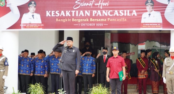 Medan, POL | Meski hujan gerimis terus mengguyur mulai sejak pagi namun Upacara Peringatan Hari Kesaktian Pancasila Tahun 2022 berlangsung penuh khidmat di halaman depan Balai Kota Medan, Sabtu (1/10/2022). Wali Kota Medan Bobby Nasution bertindak sebagai inspektur upacara (irup), sedangkan Camat Medan Kota Raja Ian Andos Lubis menjadi komandan upacara.