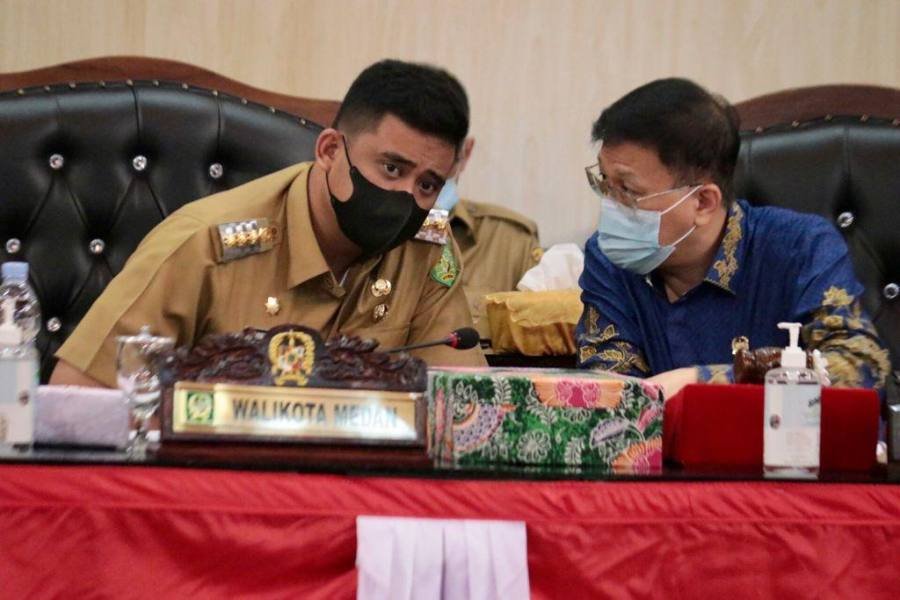 bahan Tahun Anggaran (TA) 2021 menjadi Peraturan Daerah (Perda), Selasa (28/9/2021),di Ruang Paripurna DPRD Medan. “Kepada saudara Ketua, Wakil Ketua, Ketua Fraksi, Komisi, Badan Anggaran dan seluruh anggota DPRD Medan beserta Tim Anggaran Pemko Medan yang telah mencurahkan perhatian yang penuh untuk membahas, memberi saran dan masukan, saya ucapkan terima kasih,” kata Bobby Nasution dalam Rapat Paripurna DPRD Medan Penyusunan Laporan hasil Pembahasan Perubahan APBD, Pendapat Fraksi-fraksi DPRD Medan dan Penandatanganan/Pengambilan Keputusan DPRD sekaligus Persetujuan Bersama Perubahan APBD 2021.