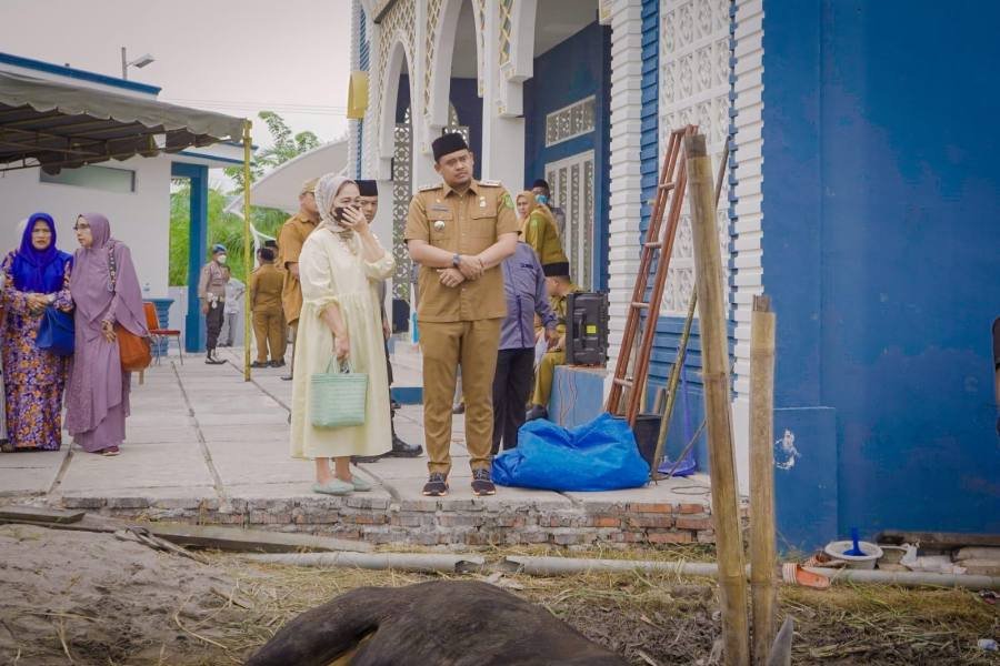 Medan, POL | Didampingi ibunda tercinta Ade Hanifah Siregar, Wali Kota Medan Bobby Nasution menyaksikan penyembelihan hewan kurban di halaman Masjid Jami’ Hanifah Jalan Chaidir, Kelurahan Nelayan Indah, Kecamatan Medan Labuhan, Senin (11/7/2022). Ada sebanyak 3 ekor sapi yang disembelih merupakan kurban orang nomor satu di Pemko Medan itu beserta keluarga.
