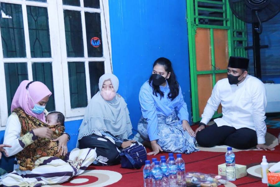 Medan, POL | Usai Shalat Tarawih, Wali Kota Medan Bobby Nasution bersama Ketua TP PKK Kota Medan Kahiyang Ayu mendatangi kediaman orang tua almarhum M Rizki Fadli di Jalan Selamat Gg Ikhlas, Kelurahan Sitirejo III, Kecamatan Medan Amplas, Minggu (10/4/2022). Selain menyampaikan belasungkawa, kedatangan orang nomor satu di Pemko Medan ini juga untuk menghibur sekaligus memberikan dukungan kepada istri dan anak almarhum yang masih berusia 8 bulan.