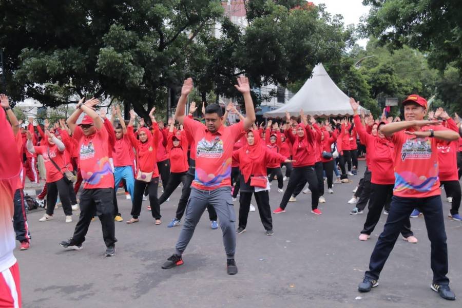 Medan, POL | Pemko Medan berhasil memecahkan rekor MURI untuk senam dengan iringan musik daerah (senam kolaborasi) dengan peserta terbanyak mencapai 17.235 orang. Penghargaan dari Musem Rekor Dunia Indonesia tersebut diserahkan langsung oleh Customer Relation Manager MURI Andre Purwandono kepada Wali Kota Medan Bobby Nasution usai mengikuti senam kolaborasi bersama dengan belasan ribu masyarakat sebagai rangkaian dari HUT Kota Medan ke 432 tahun yang diadakan di jalan Balai Kota (seputaran Lap. Merdeka Medan), Sabtu (2/7/2022).