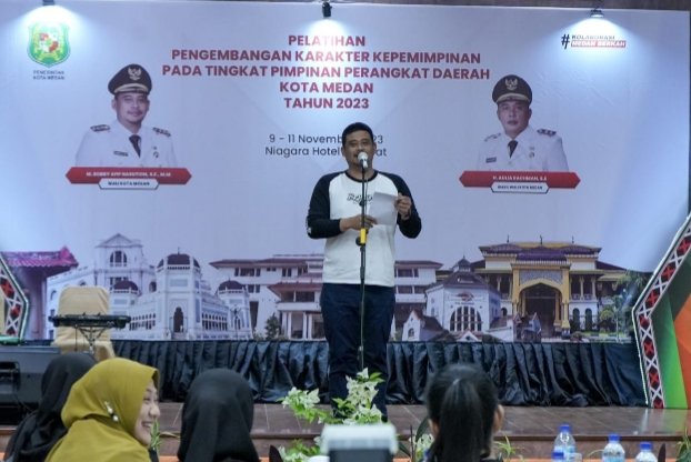 Medan, POL | Ada yang berbeda dalam Pelatihan Pengembangan Karakter Kepemimpinan pada Tingkatan Pimpinan Perangkat Daerah di Lingkungan Pemko Medan di Hotel Niagara Parapat, 9 sampai 11 November 2023. Peserta kegiatan ini bukan saja Inspektur, Kepala Badan, Kepala Dinas, Kepala Bagian Setdako, dan Camat se-Kota Medan, namun juga istri atau suami mereka. Pentingnya keharmonisan rumah tangga dalam menunjang kesuksesan pasangan hidup menjadi pesan penting pada perhelatan yang dibuka oleh Wali Kota Medan Bobby Nasution itu.