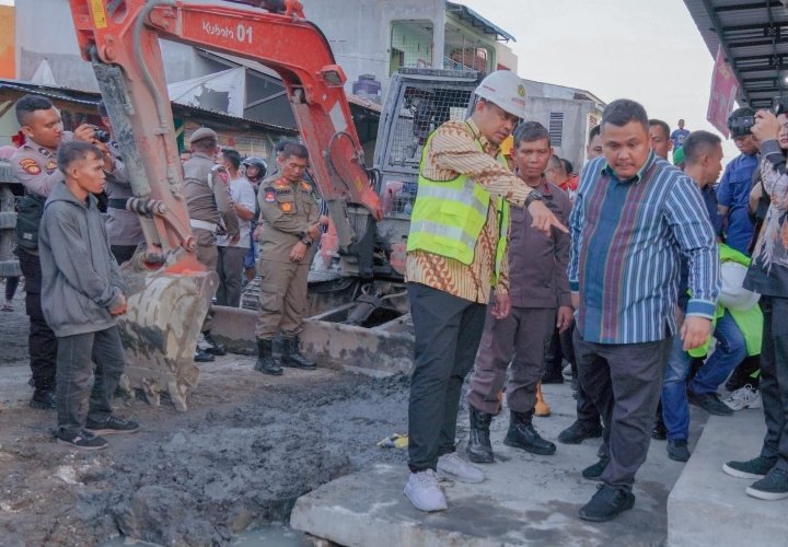 Medan, POL | Sejumlah pekerja menggunakan alat berat terlihat tengah bekerja saat Wali Kota Medan Bobby Nasution meninjau Jalan Selebes, Kecamatan Medan Belawan, Kamis (6/7/2023) petang. Kehadiran orang nomor satu di Pemko Medan ini untuk melihat progres pengerjaan pemasangan U-ditch di kawasan tersebut.