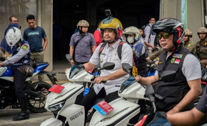 Medan, POL | Wali Kota Medan Bobby Nasution dan Gubernur Jawa Barat Ridwal Kamil mengendarai sepeda motor listrik, sebagai bentuk uji coba sekaligus sosialisasi kepada masyarakat sehingga mau beralih menggunakan kendaraan listrik berbasis baterai dalam menjalankan aktifitasnya sehari-hari, Rabu (1/2/2023).