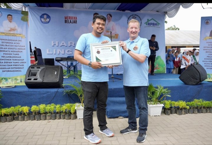 Medan, POL | Wali Kota Medan Bobby Nasution dinobatkan sebagai Pelopor Peduli Lingkungan Hidup oleh Plant and Care for Peace Finlandia. Penghargaan ini diserahkan pegiat lingkungan hidup internasional, Mika Vanhanen, dalam sebuah acara Peringatan Hari Pendidikan Lingkungan Hidup Internasional, Minggu (28/1/2024) di halaman SMP Negeri 24 Medan.