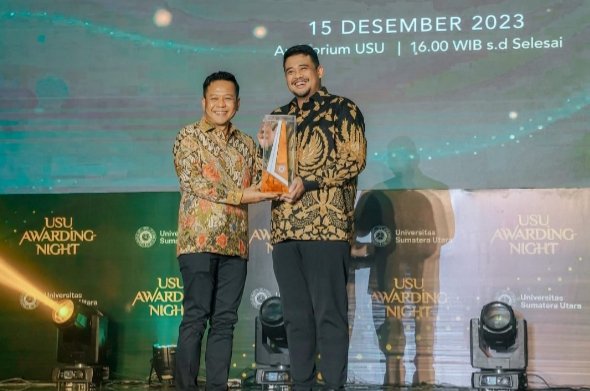Penghargaan diberikan langsung Rektor USU Muryanto Amin kepada Bobby Nasution disaksikan para Wakil Rektor, Guru Besar, stakeholder, para civitas akademisi serta ratusan mahasiswa di acara USU Awarding Night yang digelar dalam rangka Dies Natalis ke-71 USU di Auditorium USU, Jumat (15/12/2023) malam.