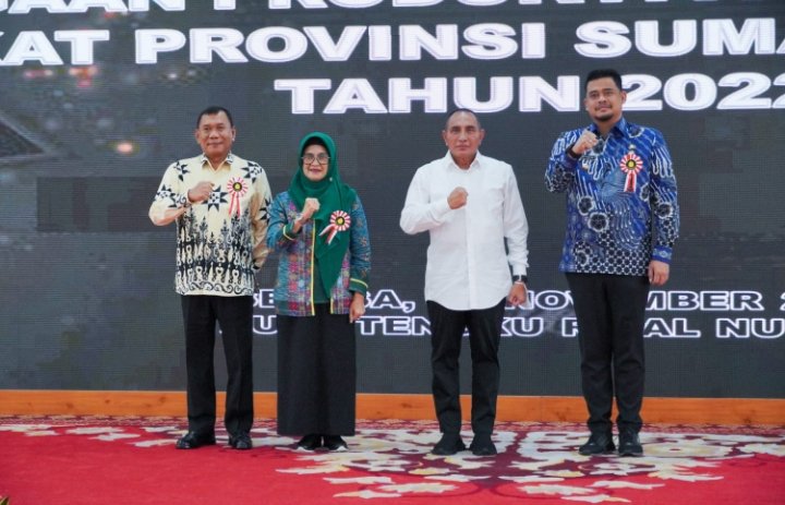 Sebelum menerima Lencana Penghargaan Produktivitas Siddhakarya Tingkat Provinsi Sumatera Utara Tahun 2022, Bobby Nasution bersama Wali Kota Pematang Siantar dr Susanti Dewayani SpA dan Bupati Deliserdang Ashari Tambunan mendampingi Gubsu memberikan penghargaan kepada pelaku usaha yang menerima Kategori Unggul dan Berkembang.