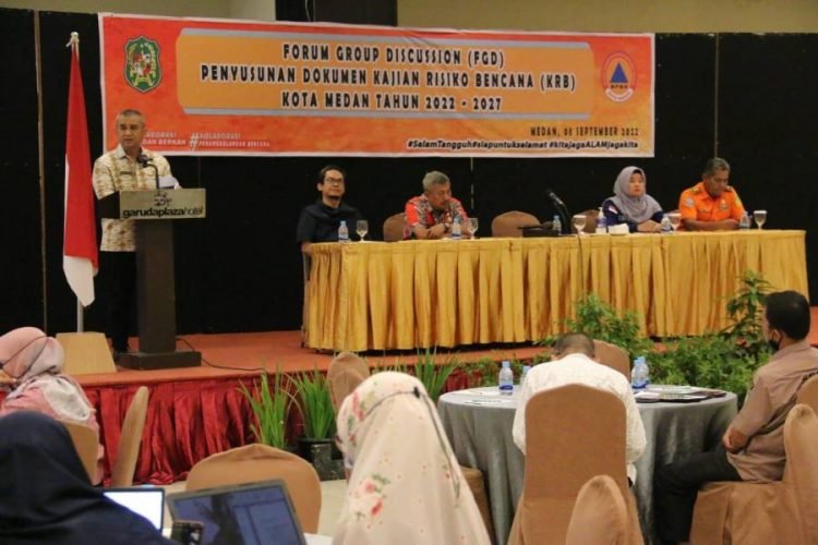 Medan, POL | Badan Penanggulangan Bencana Daerah (BPBD) Kota Medan menggelar Forum Group Discussion (FGD) dalam rangka menyusun dokumen Kajian Risiko Bencana (KRB) Kota Medan untuk tahun 2022-2027 di Hotel Garuda Plaza, Kamis (8/9/2022).
