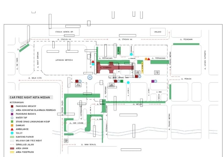 Plt Kadis Perhubungan, Suriono ketika dikonfirmasi, Jumat (27/6/2025) menjelaskan pusat kegiatan Car Free Night berada di jalan Jenderal Ahmad Yani, Kesawan. Selain itu Car Free Night juga berlangsung di seputaran kawasan lapangan Merdeka Medan, yakni di jalan Bukit Barisan, Jalan Stasiun dan Jalan Pulau Penang.