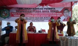 Medan, POL | Anggota DPRD Medan Wong Chun Sen membagi- bagikan masker kepada dua ratus warga saat melaksanakan sosialisasi Perda No 4 Tahun 2012 tentang Kesehatan Kota Medan di Jalan Madio Santoso, Kelurahan Pulo Brayan Darat I, Kecamatan Medan Timur, Medan, Minggu (22/03/2020).