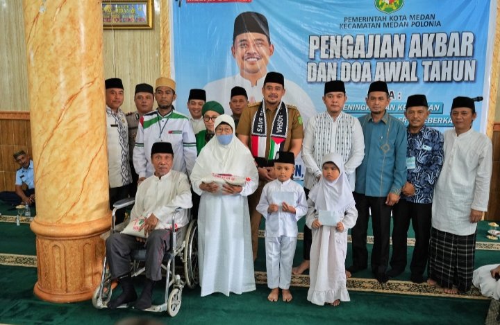 Didampingi sejumlah pimpinan Perangkat Daerah dilingkungan Pemko Medan, Wali Kota Medan, Bobby Nasution juga menyerahkan bantuan kepada anak yatim piatu dan lansia secara simbolis.