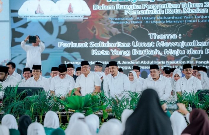 Sebelum tausiyah, dzikir dan doa bersama dimulai, Bobby Nasution dalam sambutannya menyampaikan, di penghujung tahun 2023 ini, dirinya beserta Wakil Wali Kota Medan memohon maaf jika selama masa kepemimpinan mereka, Kota Medan masih memiliki kekurangan.