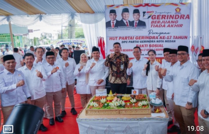 Medan, POL | Dirgahayu ke-17 Partai Gerindra disampaikan Wali Kota Medan Bobby Nasution saat menghadiri perayaan hari ulang tahun partai berlambang kepala burung garuda ini di Kantor DPC Partai Gerindra Kota Medan, Rabu (6/2/2025). Diharapkan, Partai Gerindra dapat terus berkolaborasi dan mendukung berbagai pembangunan yang dilakukan Pemko Medan.