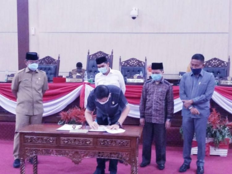 Medan, POL | Ketua DPRD Medan Hasyim SE bersama wakil DPRD Medan H Ihwan Ritonga, Rajudin Sagala dan HT Bahrumsyah. Plt Walikota Medan yang diwakili Sekda Kota Medan, Wirya Al Rahman melakukan penandatangan nota kesepakatan KUA PPAS Perubahan APBD Kota Medan Tahun 2020, di ruang rapat paripurna DPRD Medan, Selasa (18/8/2020).