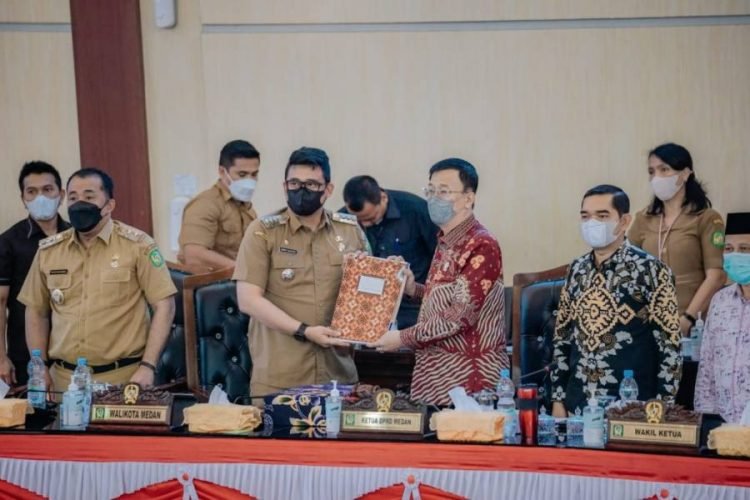 Medan, POL | DPRD Kota Medan dan Pemerintah Kota (Pemko) Medan mengesahkan Rancangan Peraturan Daerah (Ranperda) tentang Perubahan Angggaran Pendapatan dan Belanja Daerah (P-APBD) Kota Medan Tahun Anggaran 2022 di ruang paripurna DPRD Kota Medan, Senin (26/9/2022).